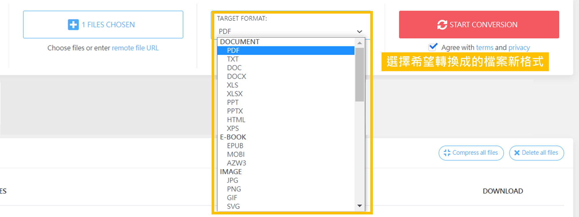 可以透過點擊「Choose Files」按鈕,上傳使用裝置上的文件檔案,或是點擊「Choose Files」按鈕底下「remote file URL」藍色字樣,就可以透過輸入線上文件的網址連結來轉換檔案,那 CDKM 每次最多可以選擇 10 個文件,文件檔案最大不超過 40MB ,其他種類的檔案格式不超過 200MB。