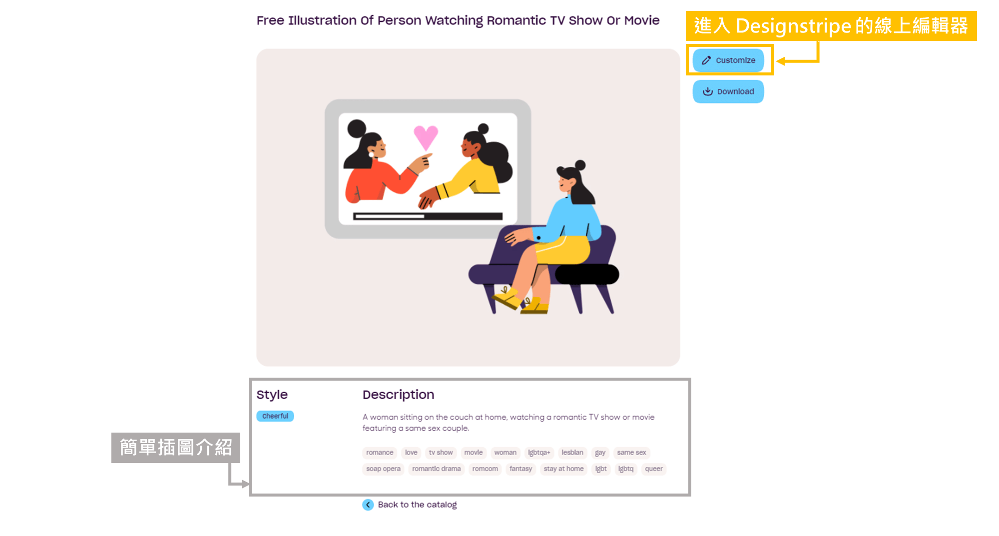 點擊插圖素材之後,會看到下面這個畫面,而畫面下方能看到關於這個插圖的簡單介紹與相關的標籤,右方則有兩個按鍵「Customize」、「Download」,點選「Download」的話就會將預設的插圖下載下來,而點選「Customize」則會進入 Designstripe 的線上編輯器。