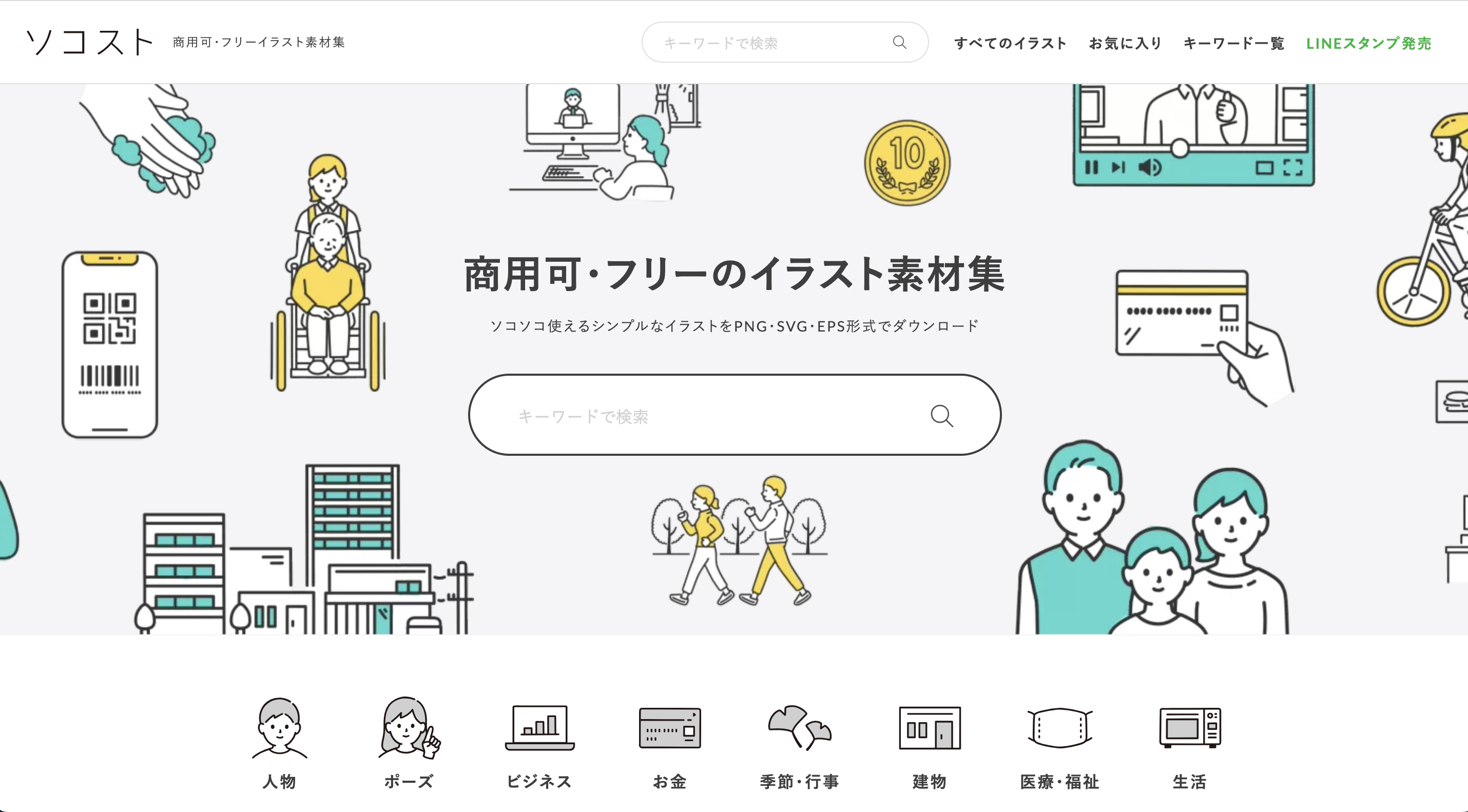 Soco-st 是一款提供免費可商用的日式插圖素材網站,網站中沒有太多廣告且使用者不用登入即可下載多款插圖,並且可以直接透過分類、標籤及搜尋功能來尋找圖片,並且直接在網站上調整配色。