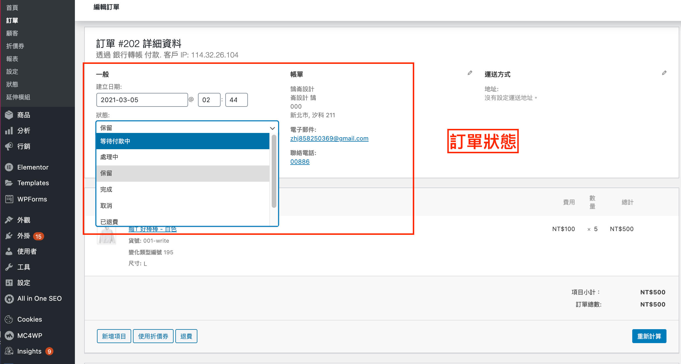 在可編輯訂單日期、訂單狀態、帳單資訊、運送方式等等,特別是多人經營電商的時候會可以利用訂單狀態顯示這筆訂單目前處理到那個階段,降低人員間的溝通成本,同時也降低出錯率。