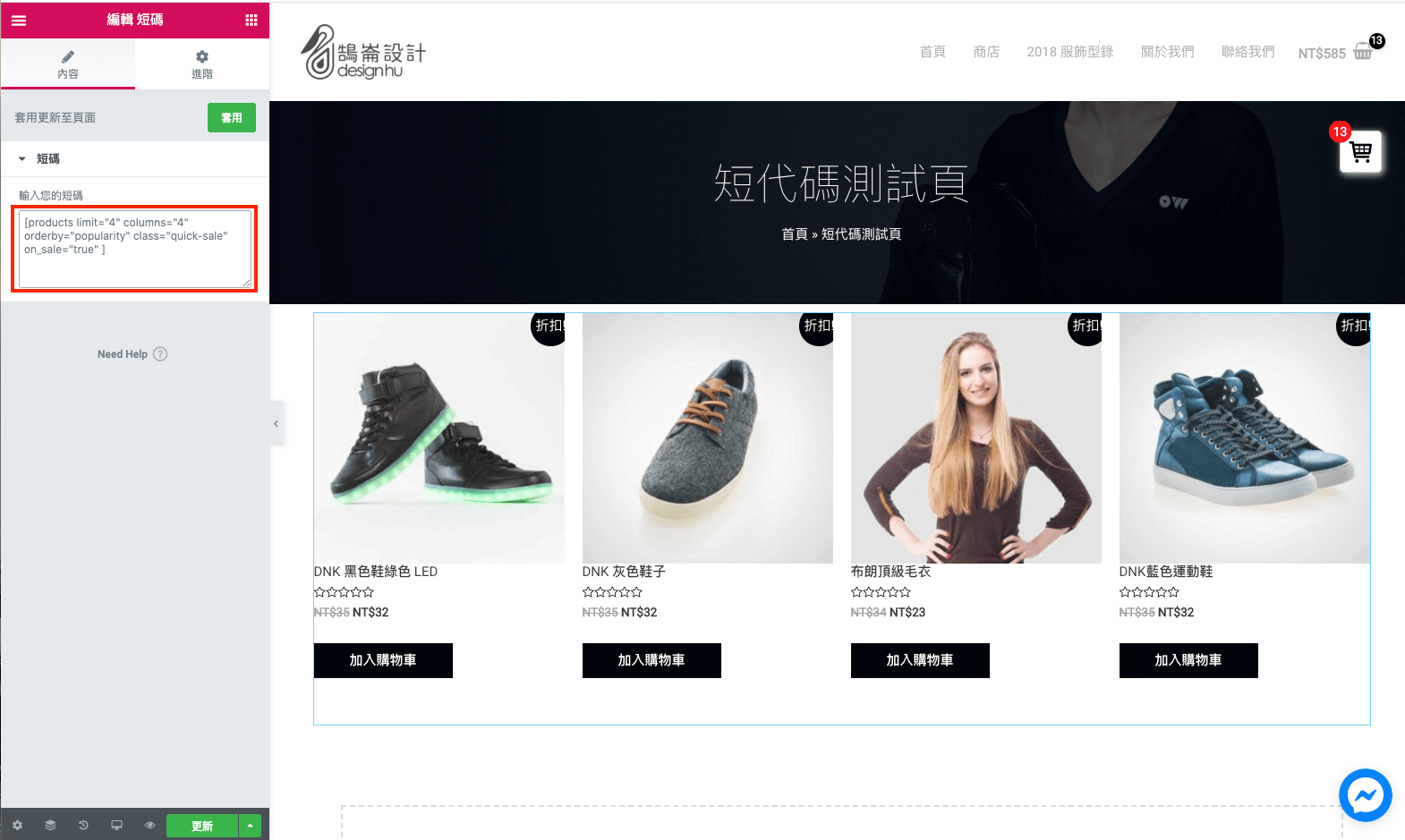 第二步:在欄位中貼上 shortcode,下圖是顯示特色商品的示意。