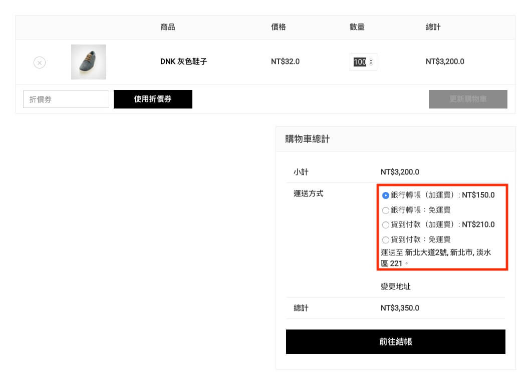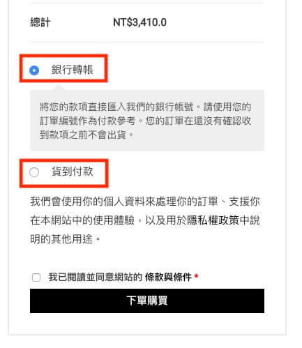 第四步:在結帳頁面會同時顯示銀行轉帳與貨到付款兩種結帳方式,筆者想做的是當顧客選擇貨到付款時,只顯示貨到付款的結帳方式。