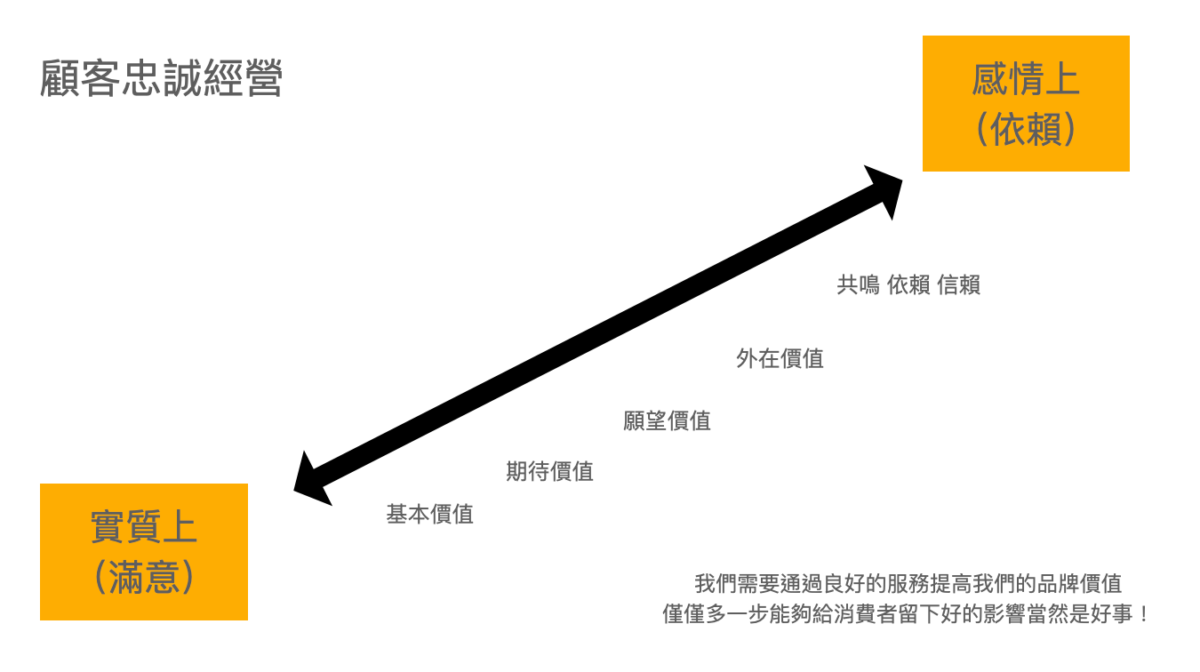 - 對期待價值的滿意:對商品或服務理當存有的期待獲得滿足(監控商品品質讓消費者信任我們的品牌)