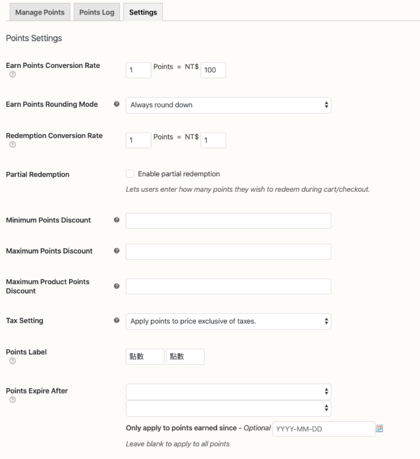 - Points Expire After:設置贈送積分後有效期限。