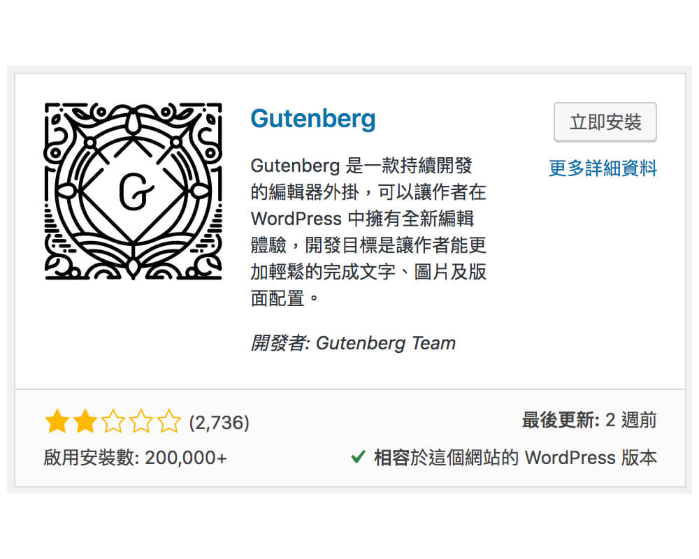 第一步:WordPress 5.0正式內建編輯器古騰堡 Gutenberg,可以在 WordPress 外掛安裝中找到,因為外掛還在開發中,所以會有一些編輯上的問題,但如果網站本身安裝的主題沒有支援 Gutenberg ,而又想試用時,就可以透過安裝 Gutenberg 啟用編輯器功能。