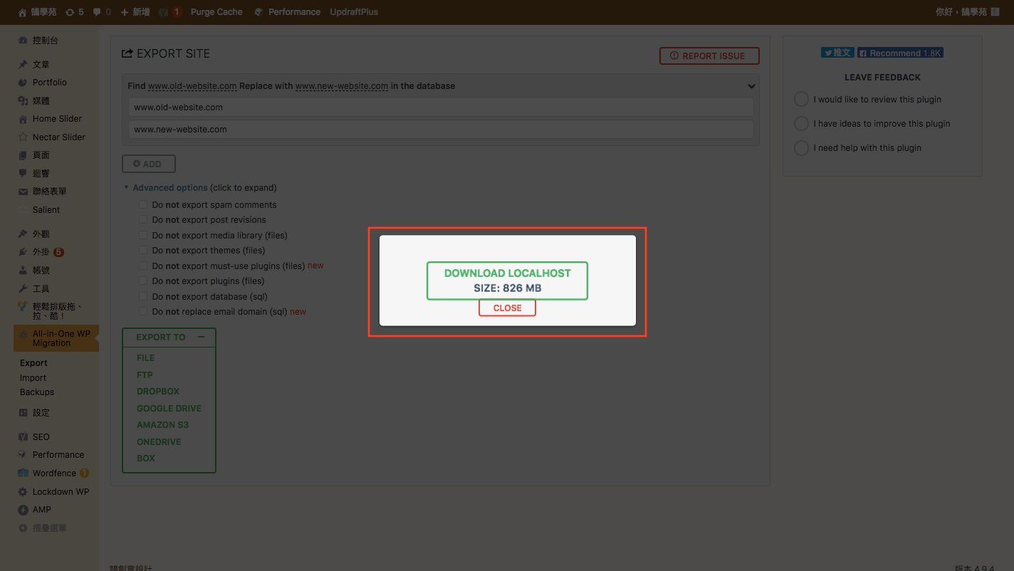 第四步:可以在側邊工具欄找到 All in one WP Migration的欄位,點擊分別有Export(輸出或導出)、Import(輸入或導入)、Backups(備份)三個選項,後面依序介紹。