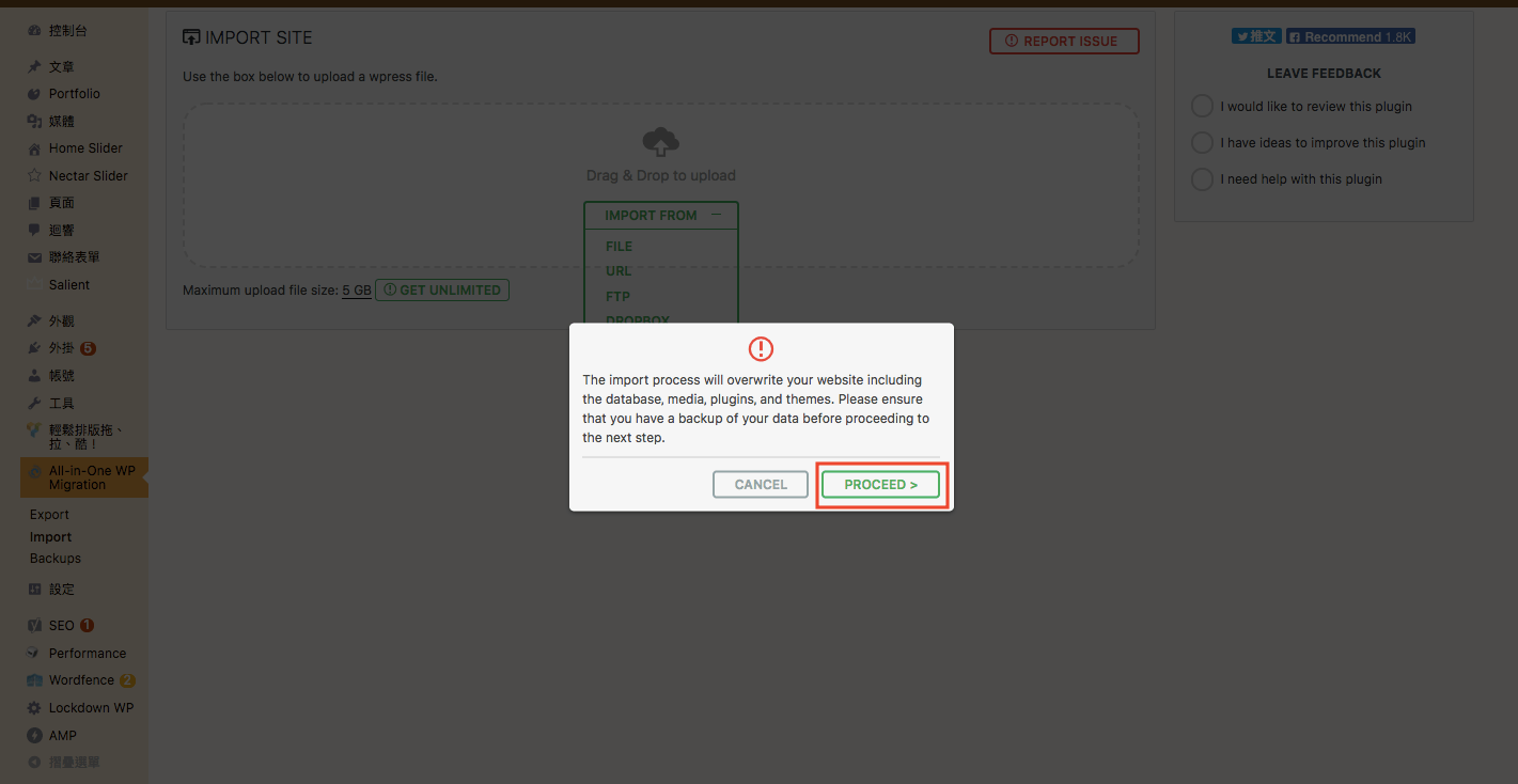 第十步:接者就會開始網站轉移到過程,在第二張圖中會跳出警告詢問將覆蓋所有新網站的檔案,通常網站搬家的目標網站都是完全空白內容的WordPress網站,所以直接點選PROCEED即可,接者就是等待外掛將舊網站資料匯入完成。