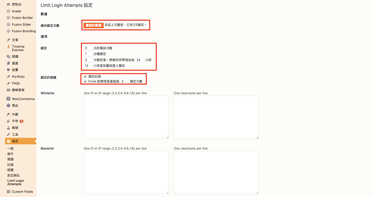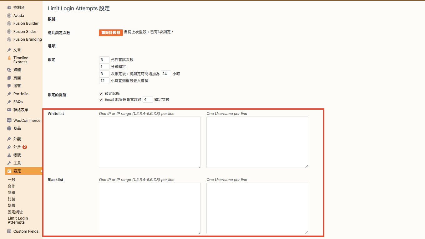 第三步:外掛安裝完成後,可以在後台介面左側選單中設定→Limit Login Attempts的選項,進入到全繁體中文的設定畫面。