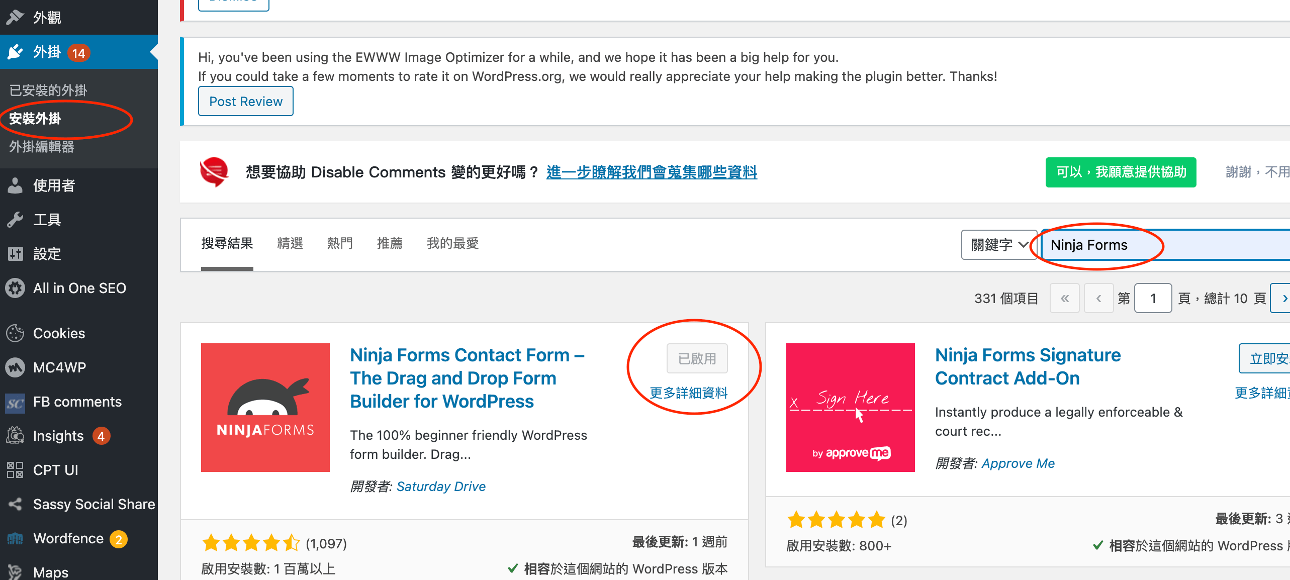 進入WordPress的後台 – 點擊外掛 – 安裝外掛 – 在搜尋欄位上搜尋Ninja Forms – 點擊立即安裝 即可