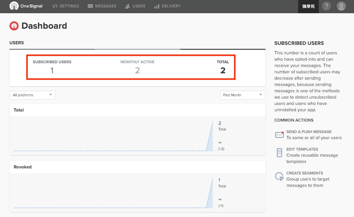 第十步:回到 OneSignal 主畫面,可以看到開啟網站通知的人數,在 Messages 中也可以自訂通知發送給所有訂閱者。