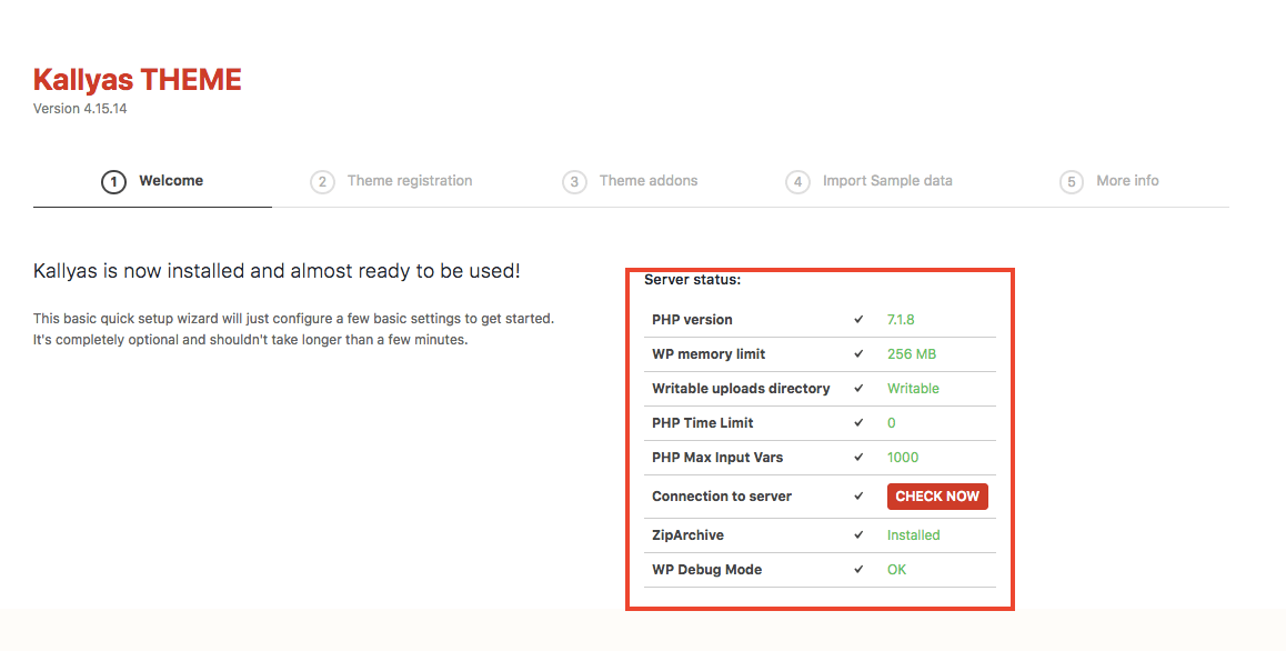 第二步:在 Connection to service 這個選項中點擊 CHECK NOW 的按鈕,就能檢查是否與Kallyas的更新伺服器連線,如果是正常的,則會如同下圖一樣出現打勾的圖示。