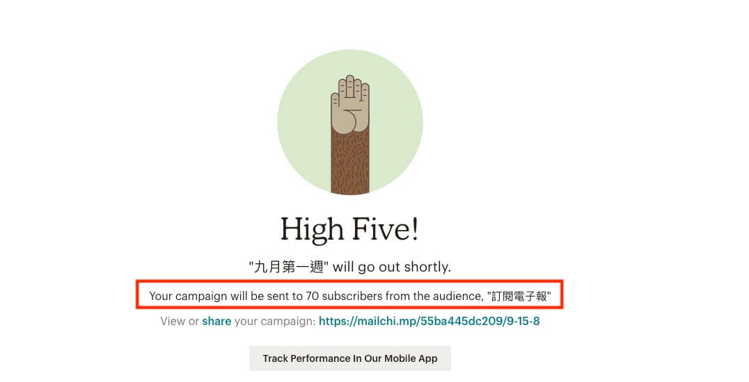 第十七步:會下圖是發送成功的畫面,會有發送給群組中總共多少訂閱者的說明文字。