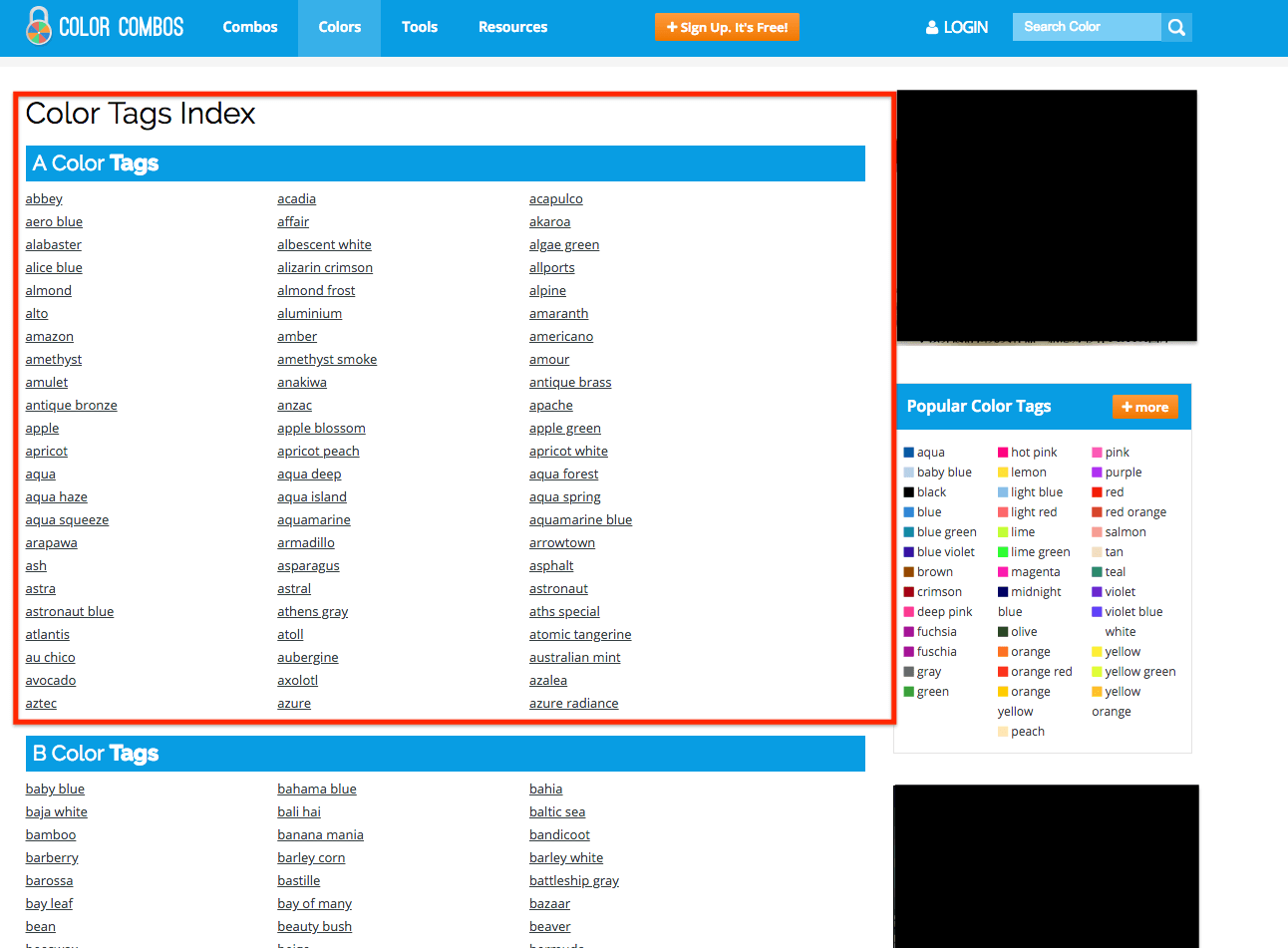 第三步:點選 Colorcombos 上方 colors 的選項,可以看到有比較多人使用的主流顏色,這裡色彩流行度的資料來源,是從 Colorcombos 網站配色分析工具中所得來的,也就是説這些列出的顏色是大部分網站會選擇的配色,越多被使用的顏色,也就代表其能被大部分瀏覽者接受的程度會較高。